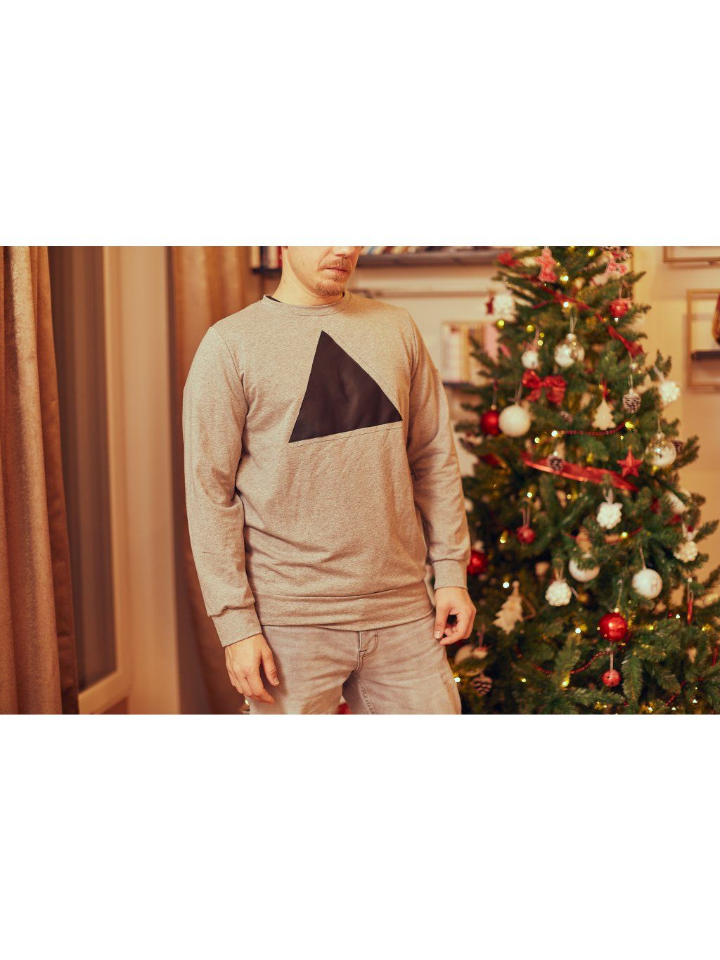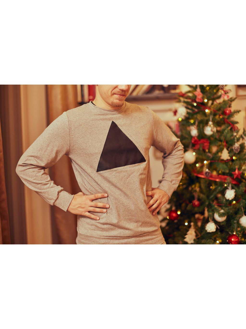 Mikina z šedé slabší teplákoviny, která má vpředu aplikaci černého koženkového trojúhelníku.