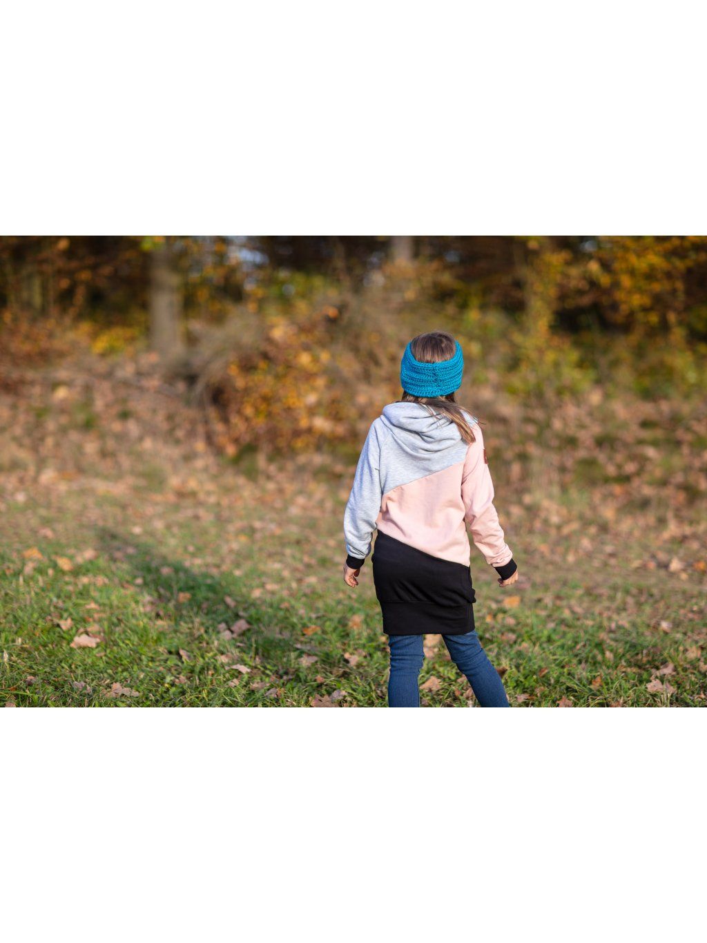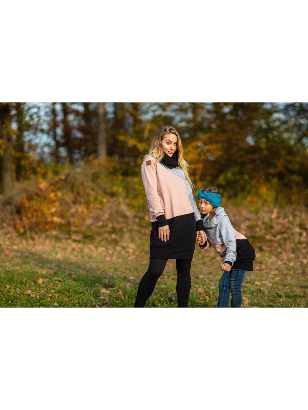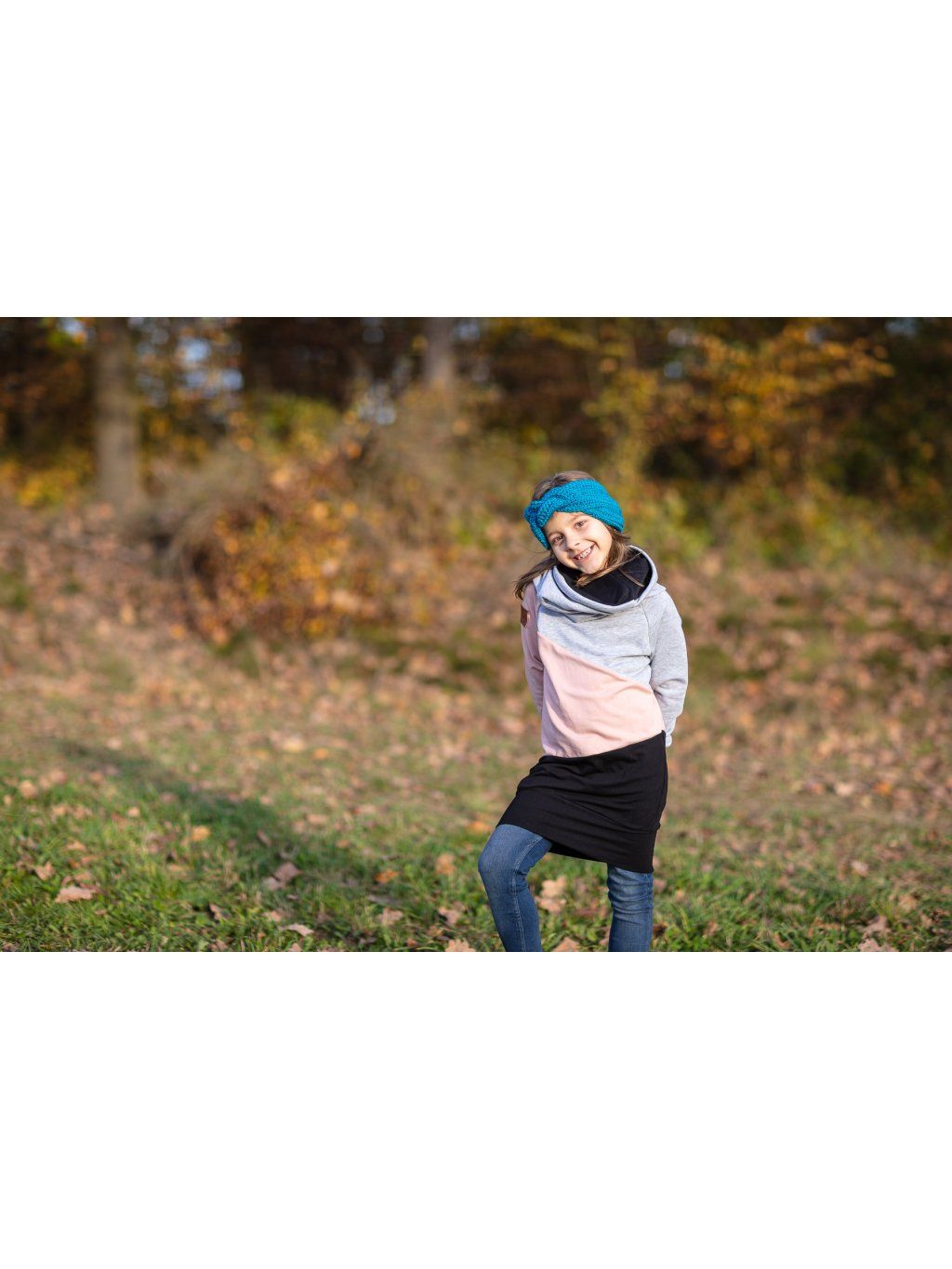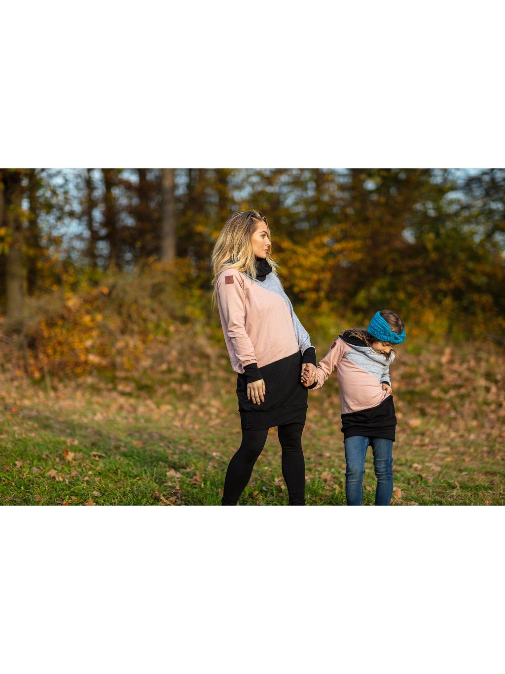 Stylová dlouhá mikina má spíše volnější střih, je ušita z růžové,bílé a šedé teplákoviny. Mikina má okolo krku tunel, který je součástí mikiny a dole je stažena do nápletu.