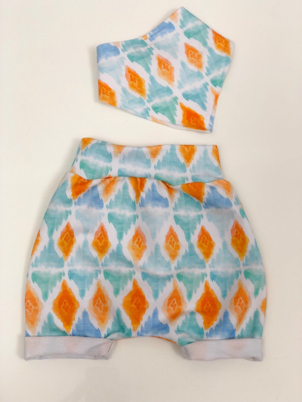 Miminkovský set, který obsahuje dvojkombinaci - baggy kraťásky a šáteček jako bryndáček. Je ušitý z teplákoviny, která splňuje normu OEKO-TEX Standard 100 pro děti do 3 let. Vyrobeno v ČR.