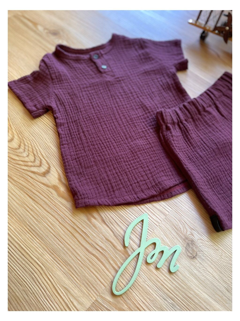 Set se skládá ze 2 dílů - košilové tričko na knoflíčky a kraťásky ve vínové barvě.