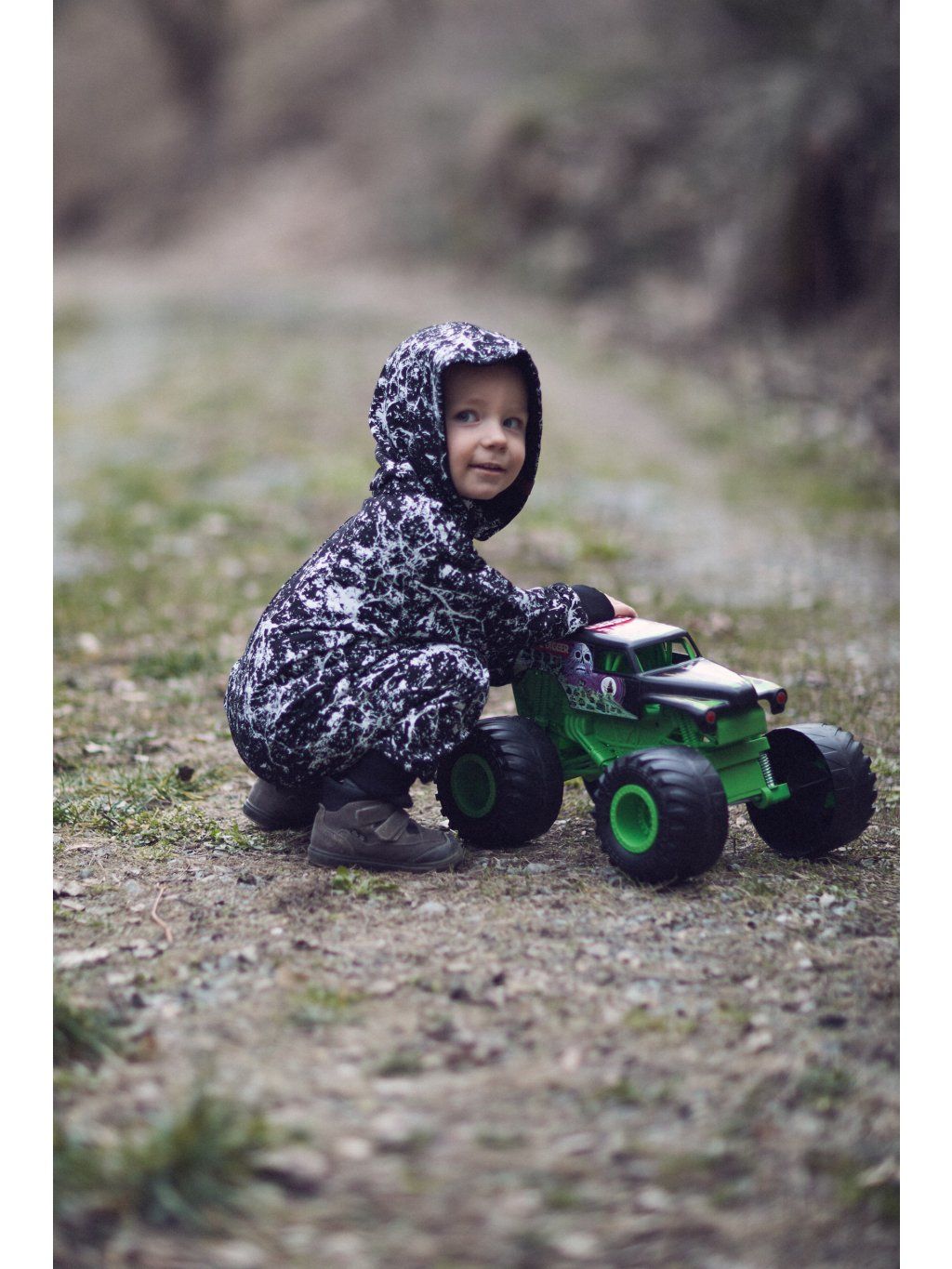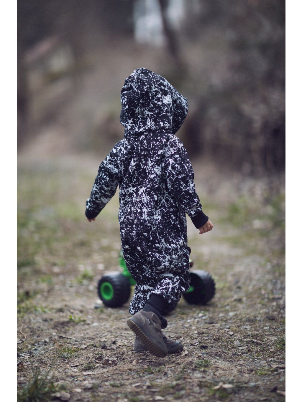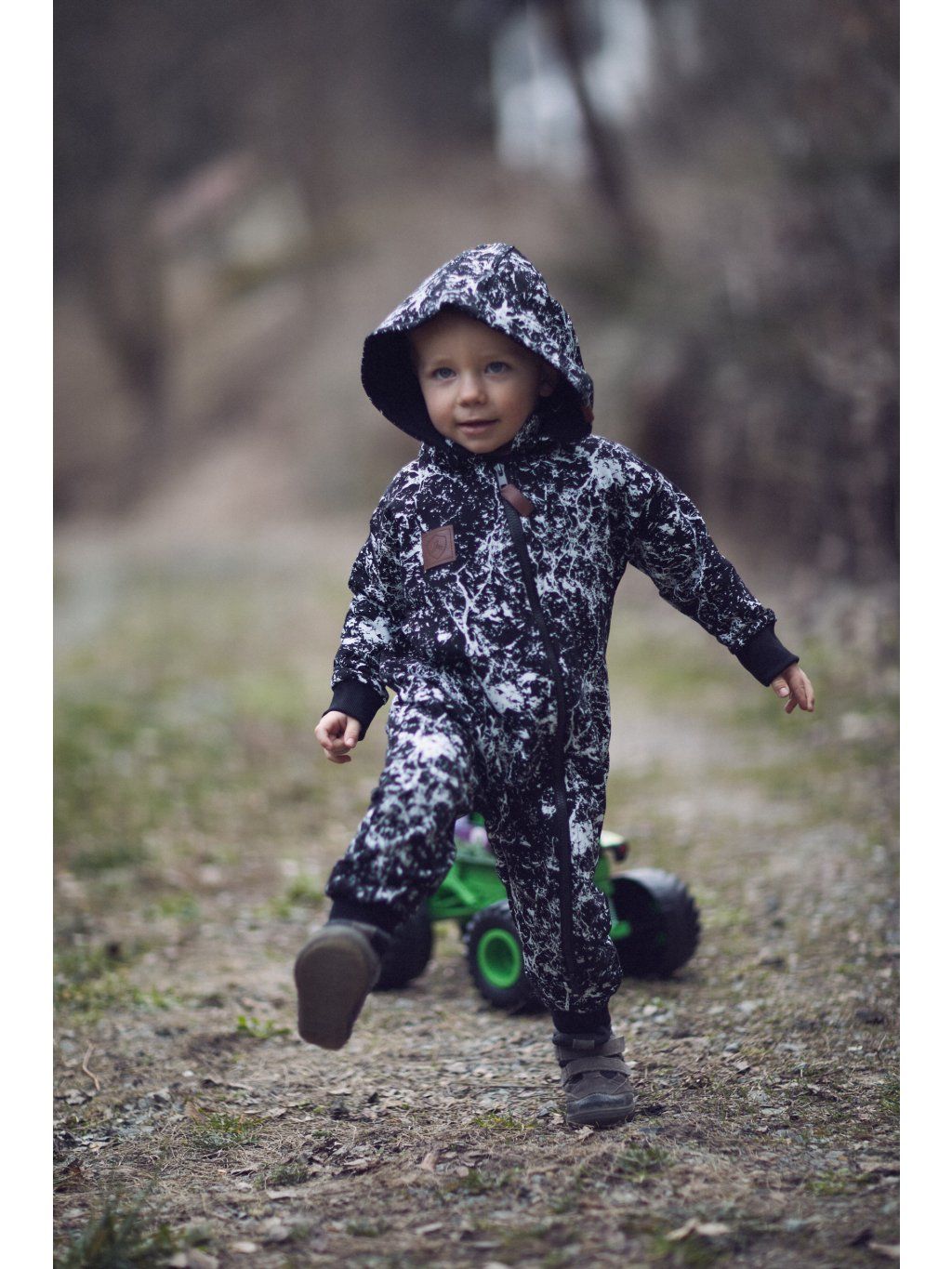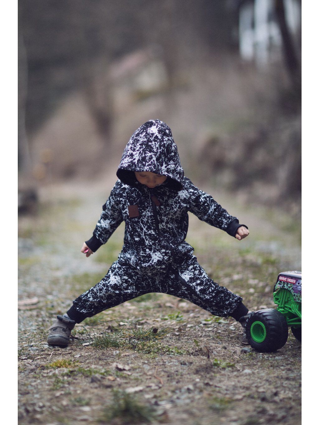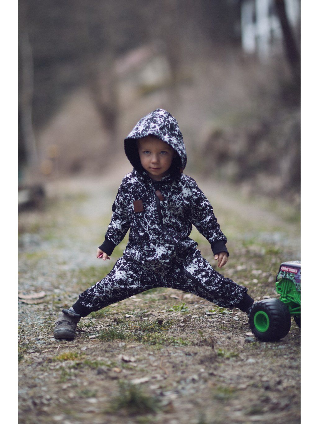 Overálek z černé počesané teplákoviny bavlna/elastan s potiskem z kolekce ART. Overal má odepínací kapucu a podložení pod celou délkou zipu, aby nedošlo ke zranění.