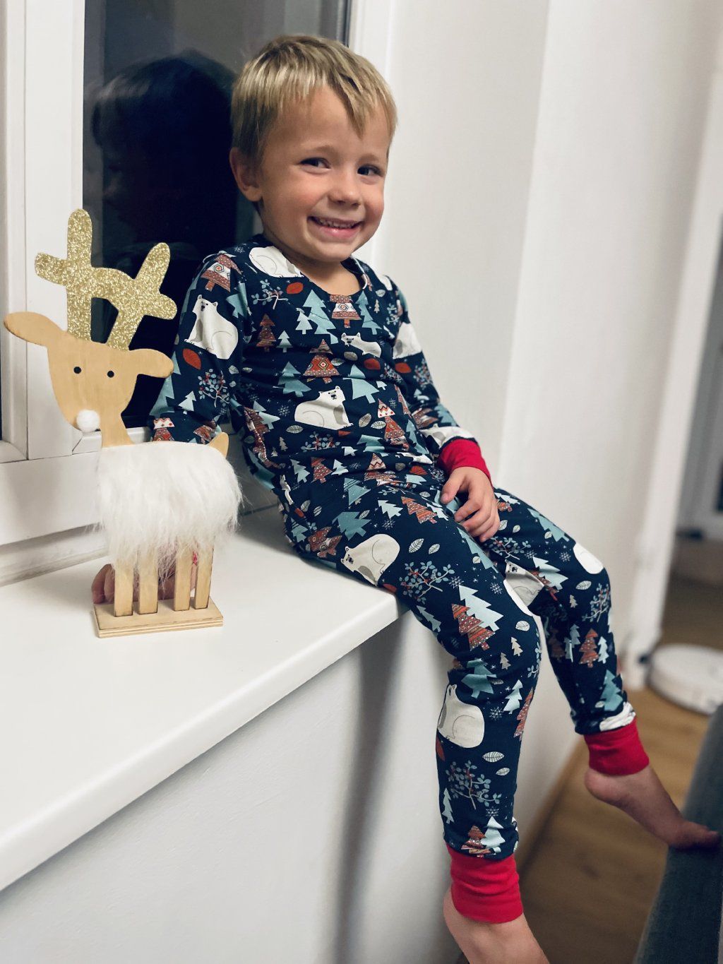 Pyžámko POLAR BEAR je ušité z elastického bavlněného úpletu. Pyžámko je tmavě modré se zimním motivem a s medvědama.