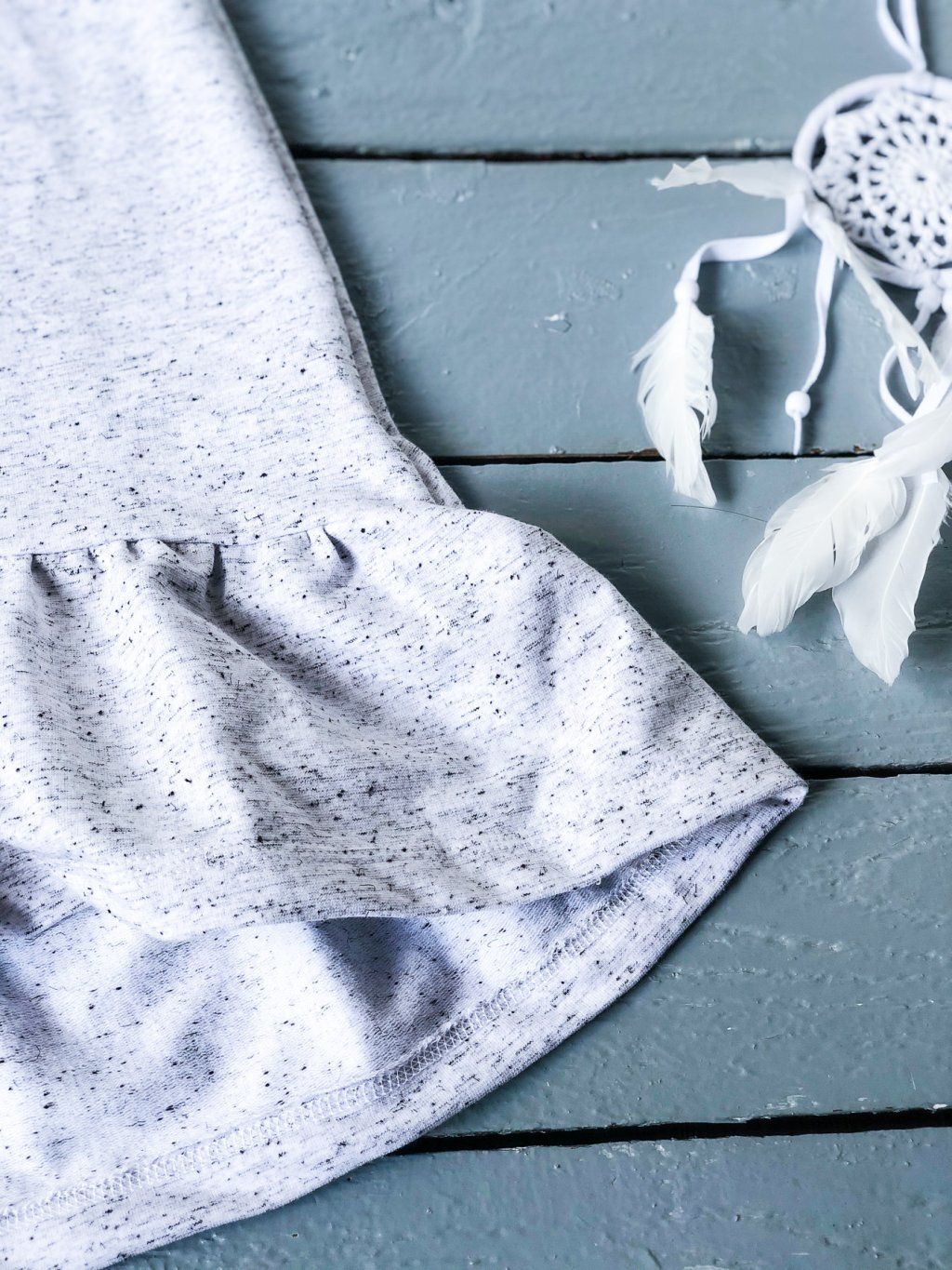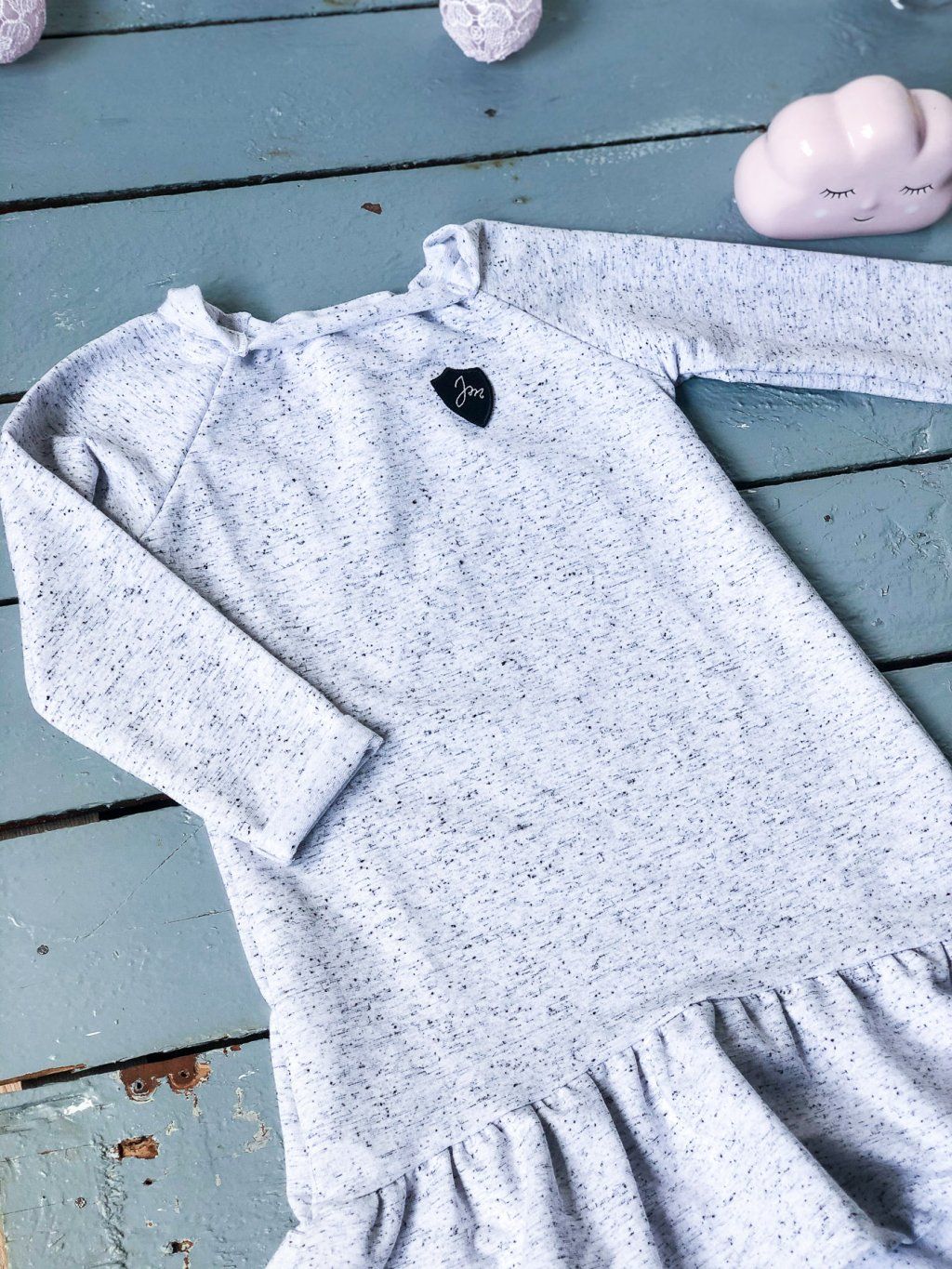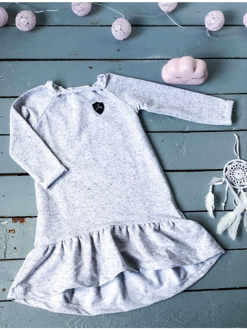Šaty z příjemné bavlněné teplákoviny z bavlny a elastanu. Mají dlouhý rukáv a jsou zakončené bohatým volanem. Mají zajímavě řešený výstřih.