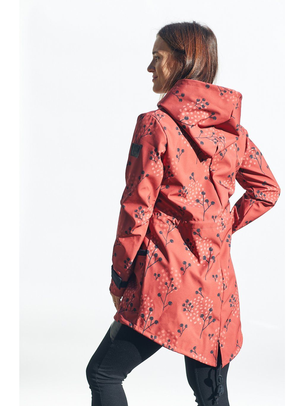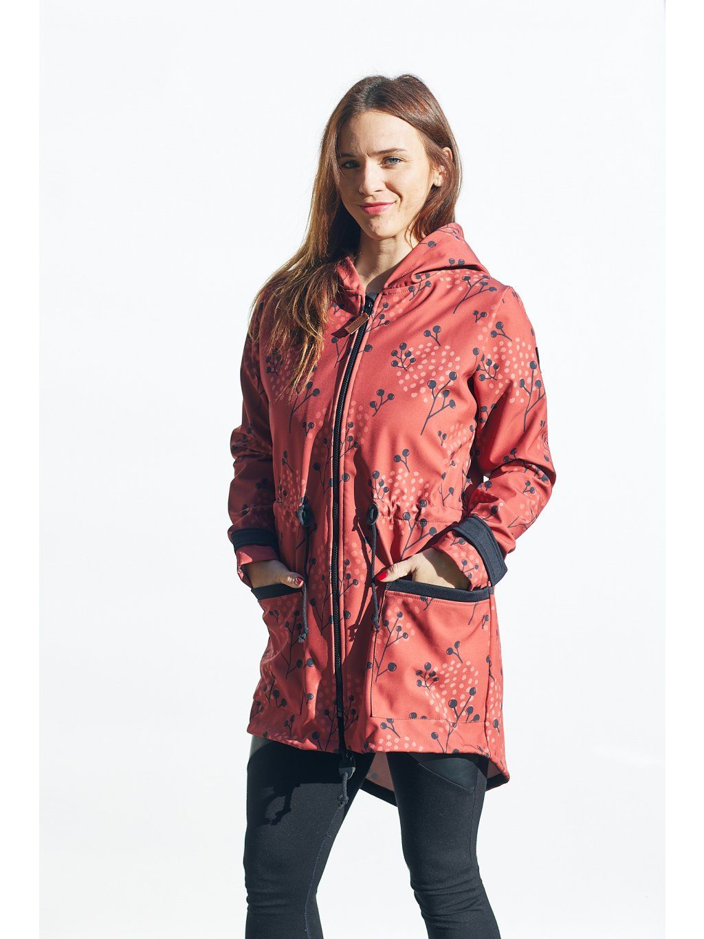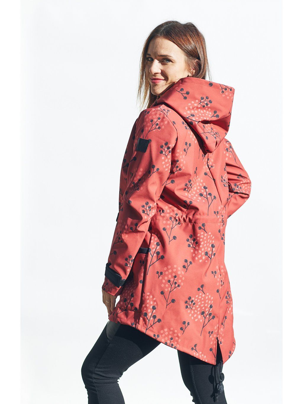 Vpředu je na zip a s kapsami, v pase je tunýlek. Barva je skořicová kombinovaná s černým softshellem, kterým jsou lemované kapsy a suché zipy na stahování rukávu. Parka se dá nosit na jaře, na podzim, s teplejšími vrstvami i v zimě.