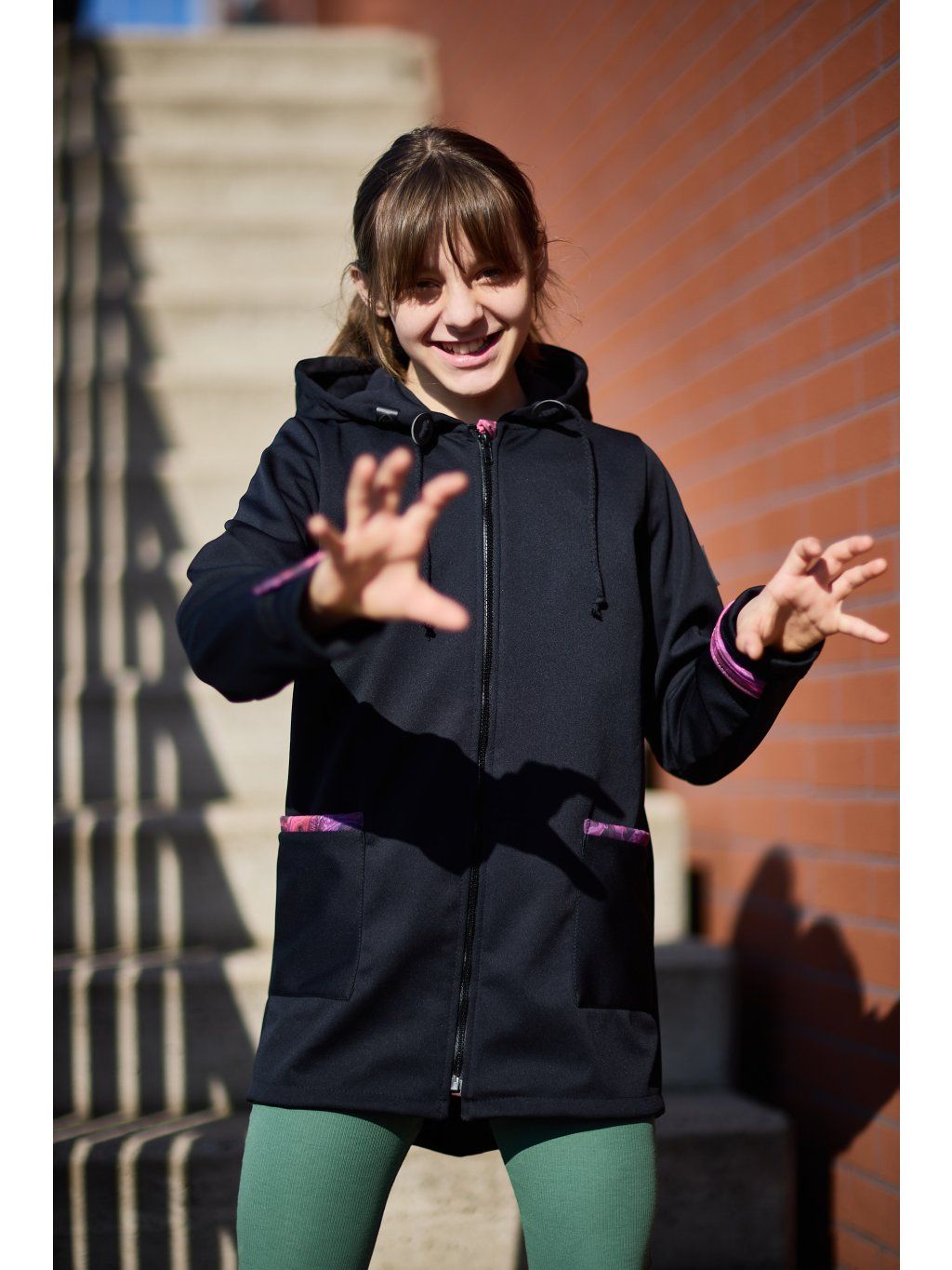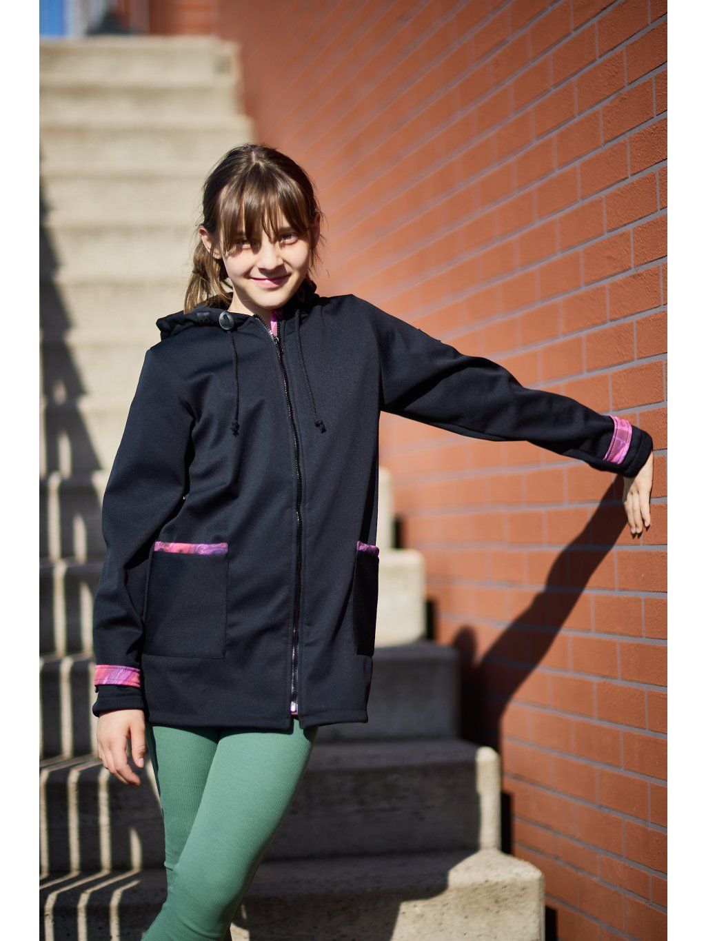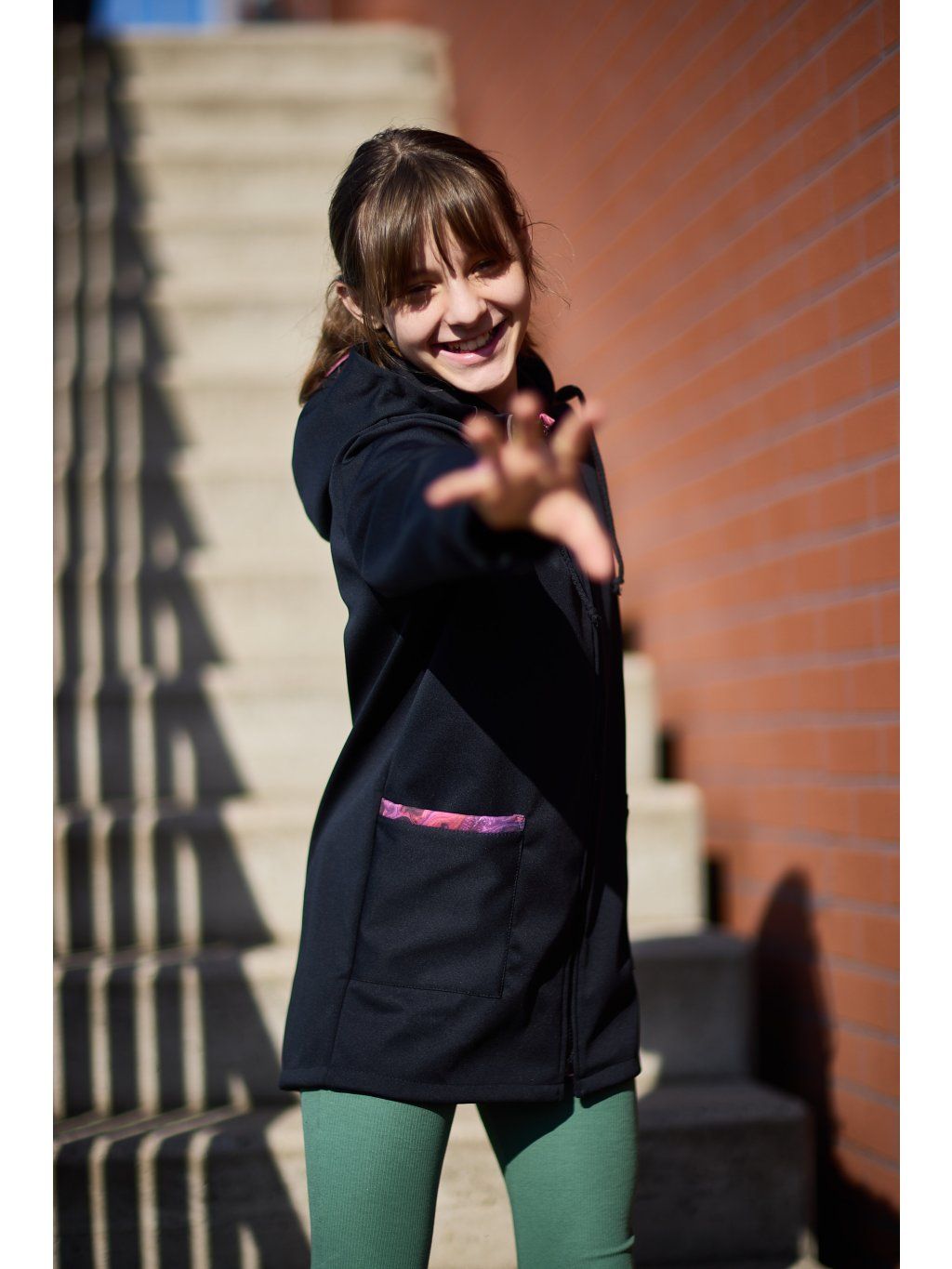 Softshellová bunda je ušitá z černého pružného softshellového materiálu, který má zespod fleece. Kapsičky na předním díle, pruh na zádech a přes kapuci jsou ze softshellu s akvarel motivem. Střih je sportovní, ale stylový. Dá se nosit na podzim a v zimě. Rukávy jsou zakončené gumičkou. Zadní díl je střižený dokulata, přední rovně.