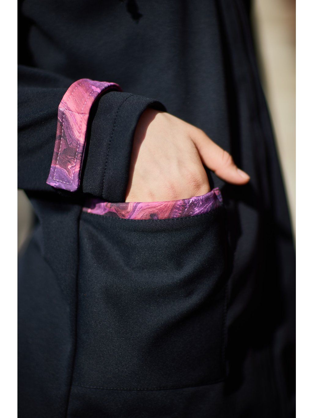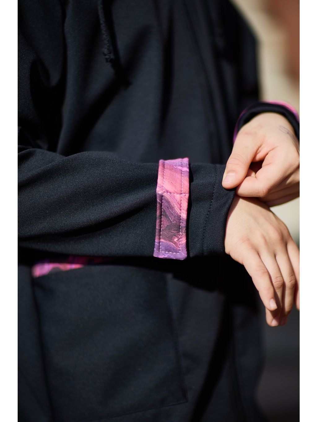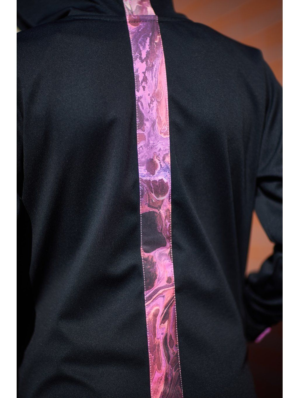 Softshellová bunda je ušitá z černého pružného softshellového materiálu, který má zespod fleece. Kapsičky na předním díle, pruh na zádech a přes kapuci jsou ze softshellu s akvarel motivem. Střih je sportovní, ale stylový. Dá se nosit na podzim a v zimě. Rukávy jsou zakončené gumičkou. Zadní díl je střižený dokulata, přední rovně.