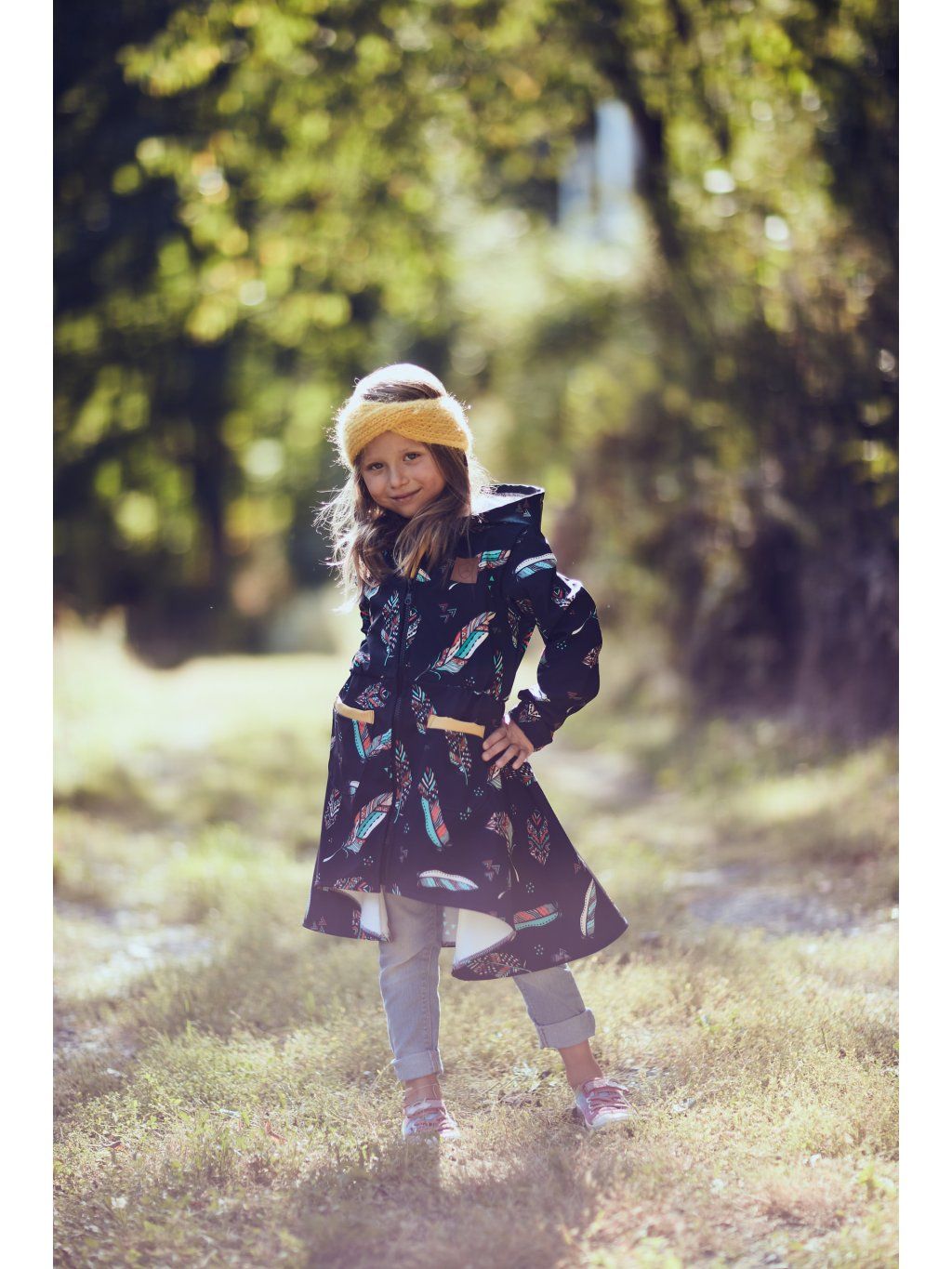 Softshellový kabátek je ušitý z tmavomodrého softshellového materiálu, který má zespod fleece a je potištěn krásným motivem pírkem. Softshell s fleecem má tyto vlastnosti: