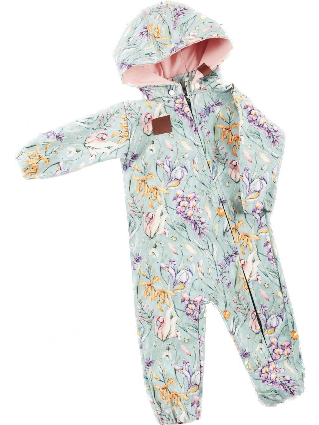 Vnitřní strana látky je tenký fleece. Kombinéza má světlemodrou barvu s potiskem květin. A uvnitř kapuce je tmavěrůžová podšívka z bavlněného úpletu s elastanem ( foto č.2 )
