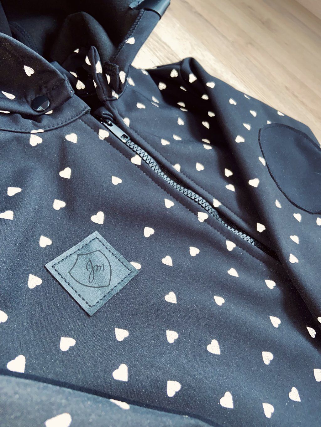 Softshellová kombinéza je ušitá z černého softshellu se silnějším fleecem, na sobě má potisk srdíček, které se po nasvícení lesknou.