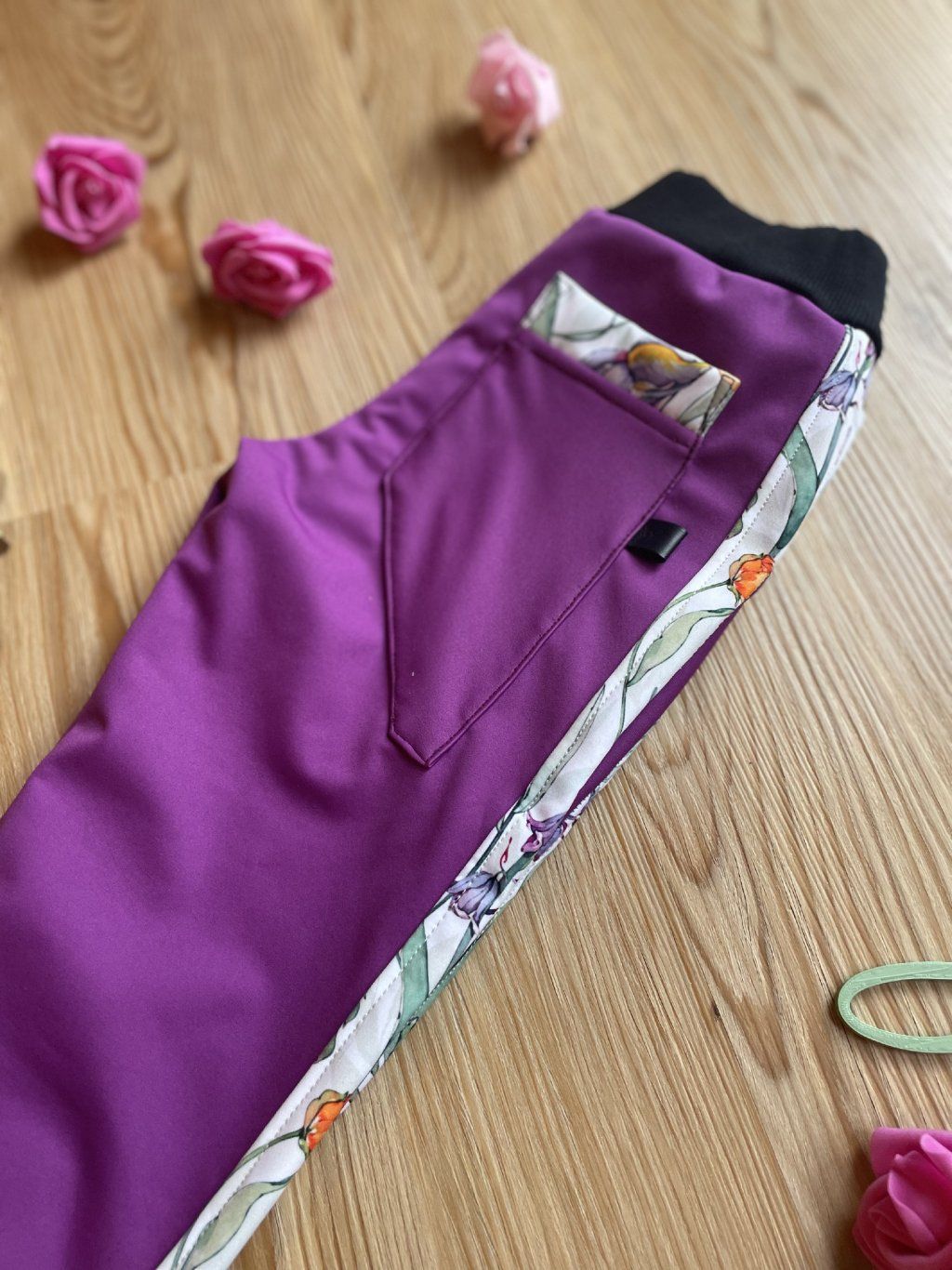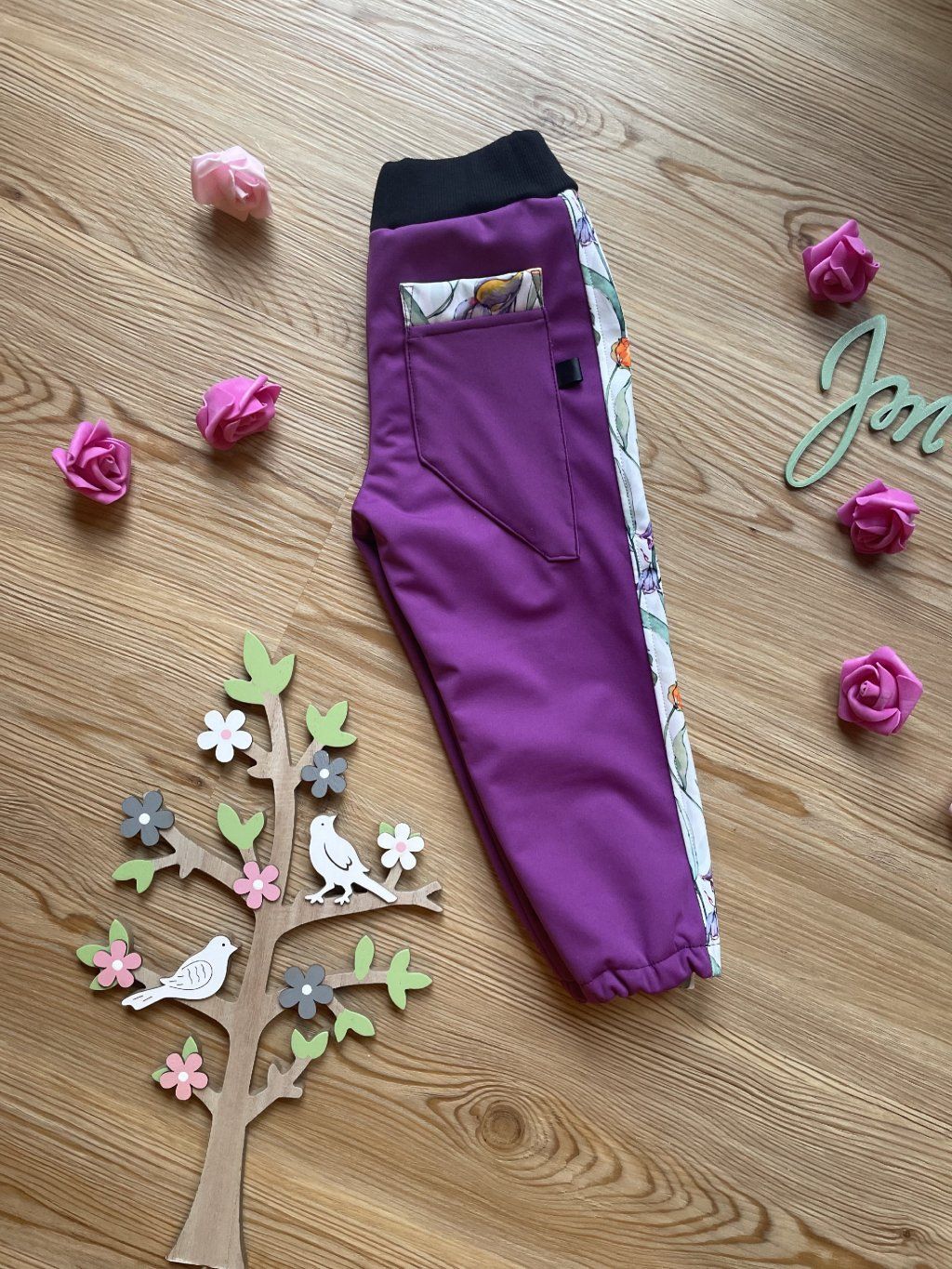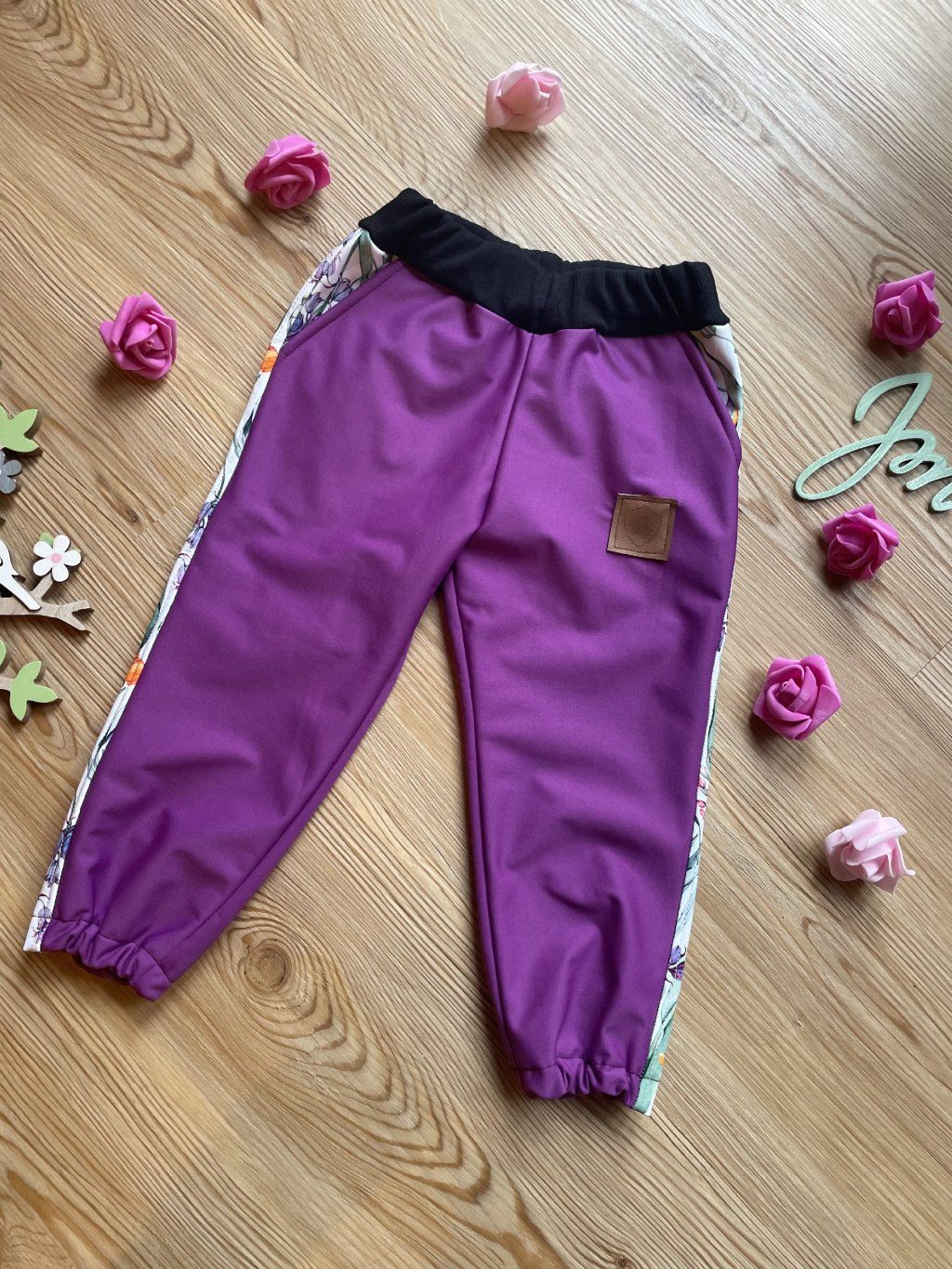 Softshellové kalhoty mají zespod fleece. Na nohavicích jsou ozdobné lampasy ze softshellu s motivem kytiček. Kalhoty jsou vsazeny do pasového límce z růžového žebrovaného úpletu, ve kterém je ještě guma. Nohavice jsou stažené do gumiček. Mají postranní kapsy a vzadu jednu šikmou kapsu. Dají se nosit na podzim, v zimě i na jaře.