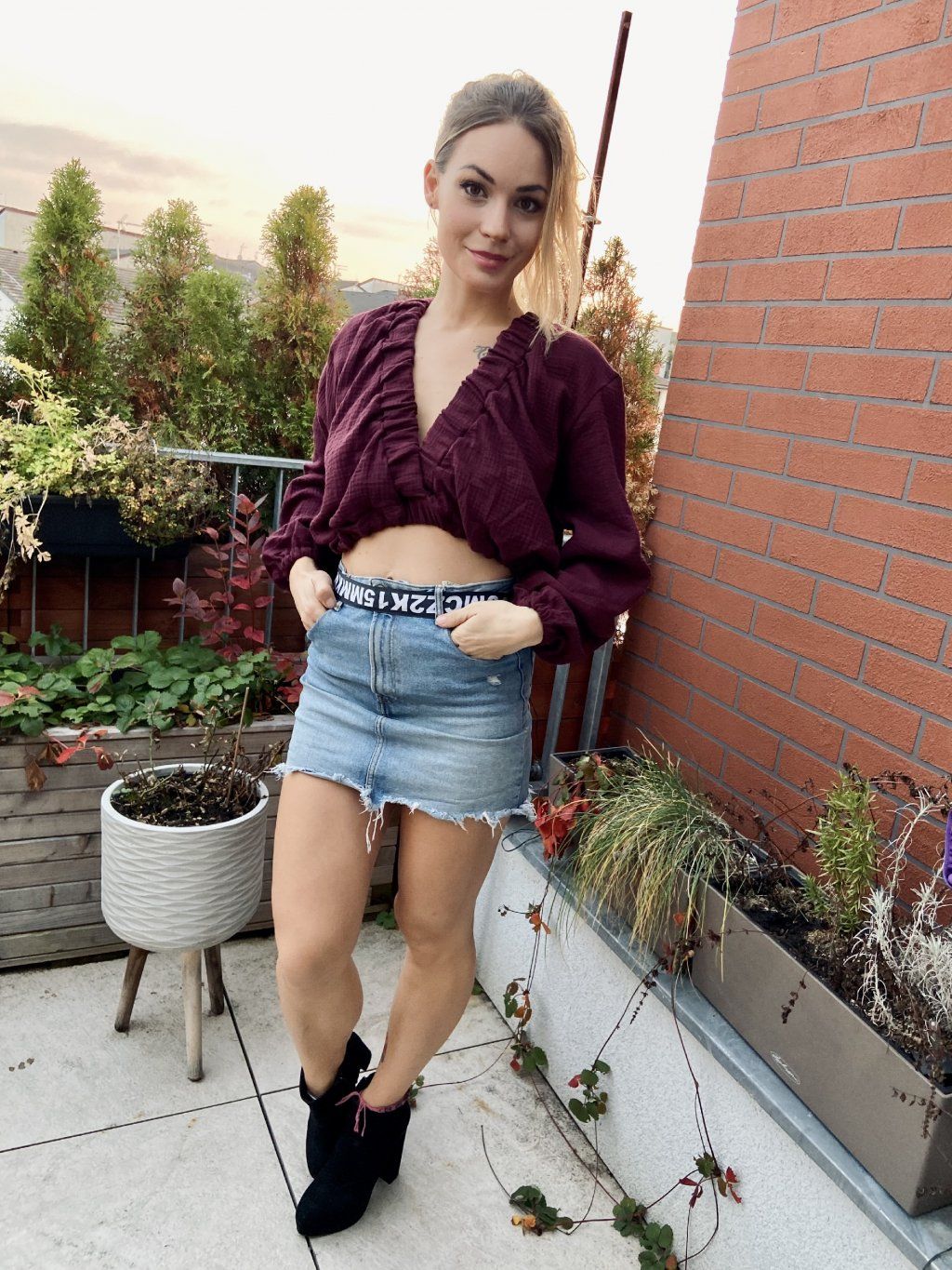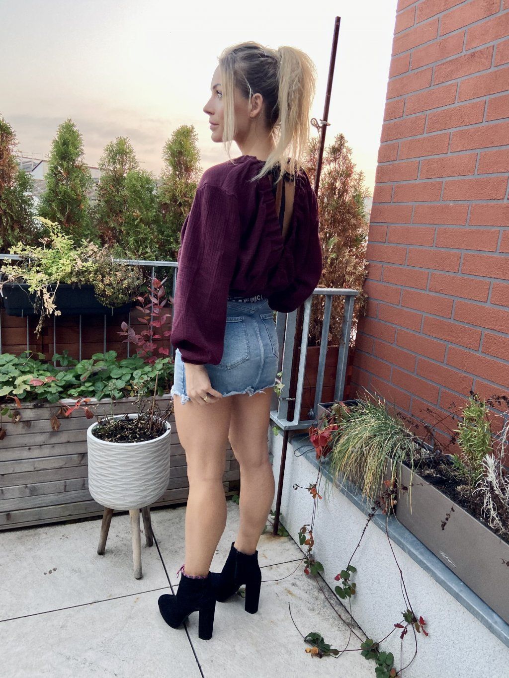 Top je ušitý z bavlněného mušelínu. Vpředu i vzadu je hluboký véčkový výstřih. Zadní díl ka chycen saténovou stuou, aby nepadal z ramen. V pase je do gumy. Zakončení rukávu je také na gumičku.
