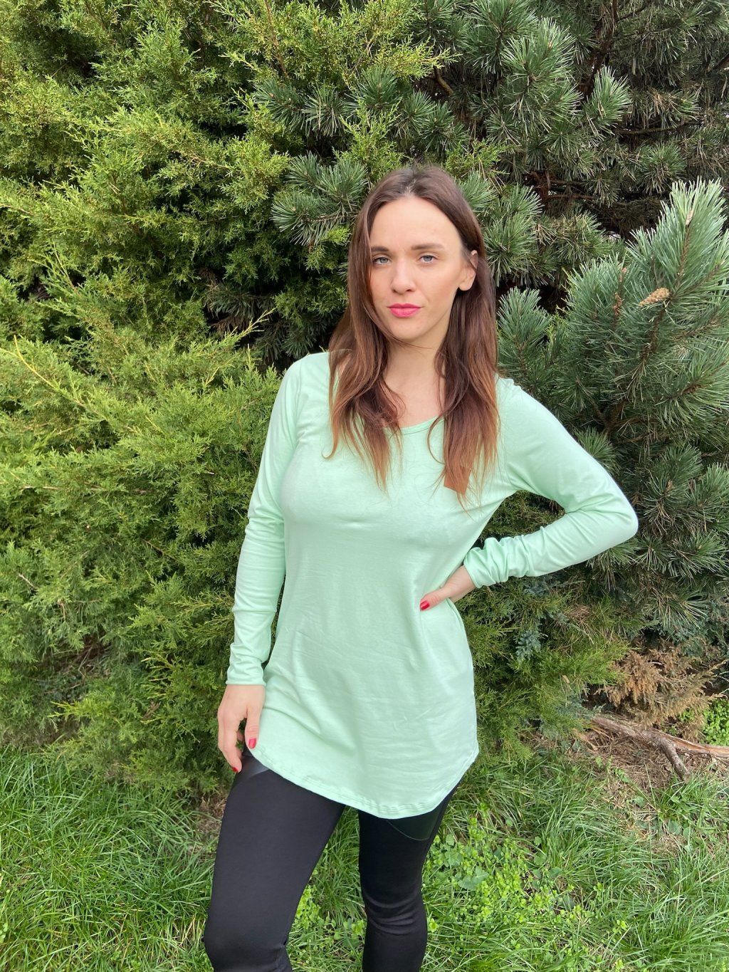 Barva trička je pastelově zelená.